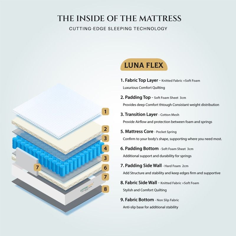 The LunaFlex T.Top Pocket Spring Mattress from Cotton Home redefines restful sleep with its advanced design and premium build. At its core lies an individual pocket spring system, crafted to deliver ergonomic support while preventing partner disturbance, ensuring both you and your loved ones sleep peacefully through the night.