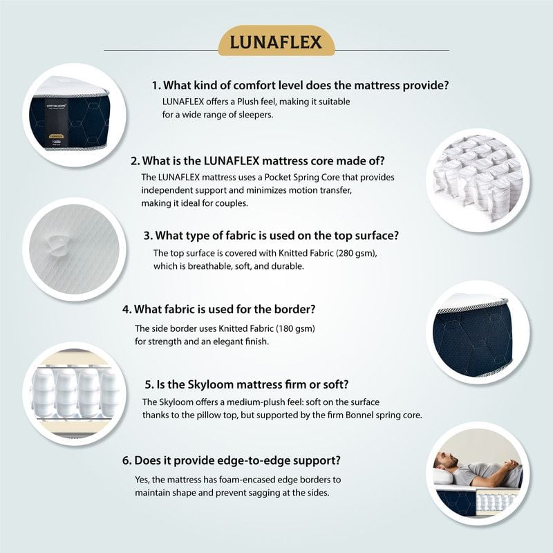 Discover the perfect balance of comfort and support with the LunaFlex T.Top Pocket Spring Mattress. Designed for peaceful, refreshing sleep, it combines edge-to-edge stability, plush comfort layers, and zero partner disturbance — ideal for couples, families, and light sleepers.