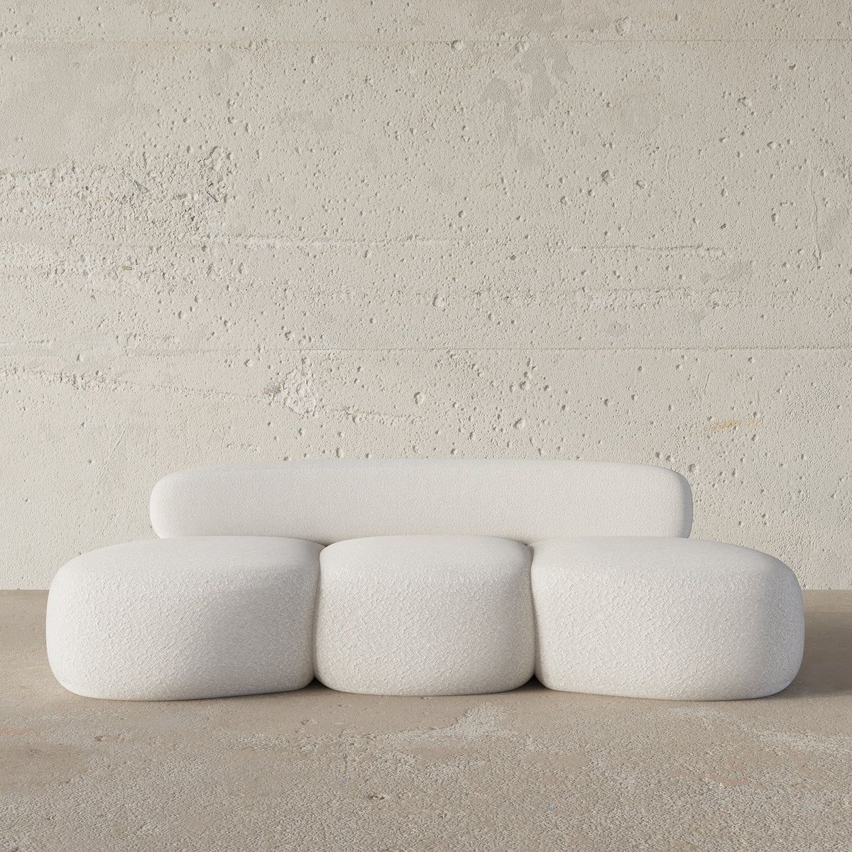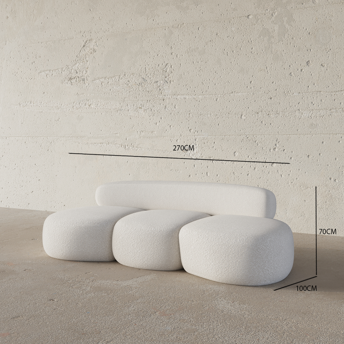 This 3 Seater Curved Sofa features a vintage-inspired curve, soft wool fleece upholstery in elegant ivory white, and plush cushioning, creating a welcoming and sophisticated ambiance