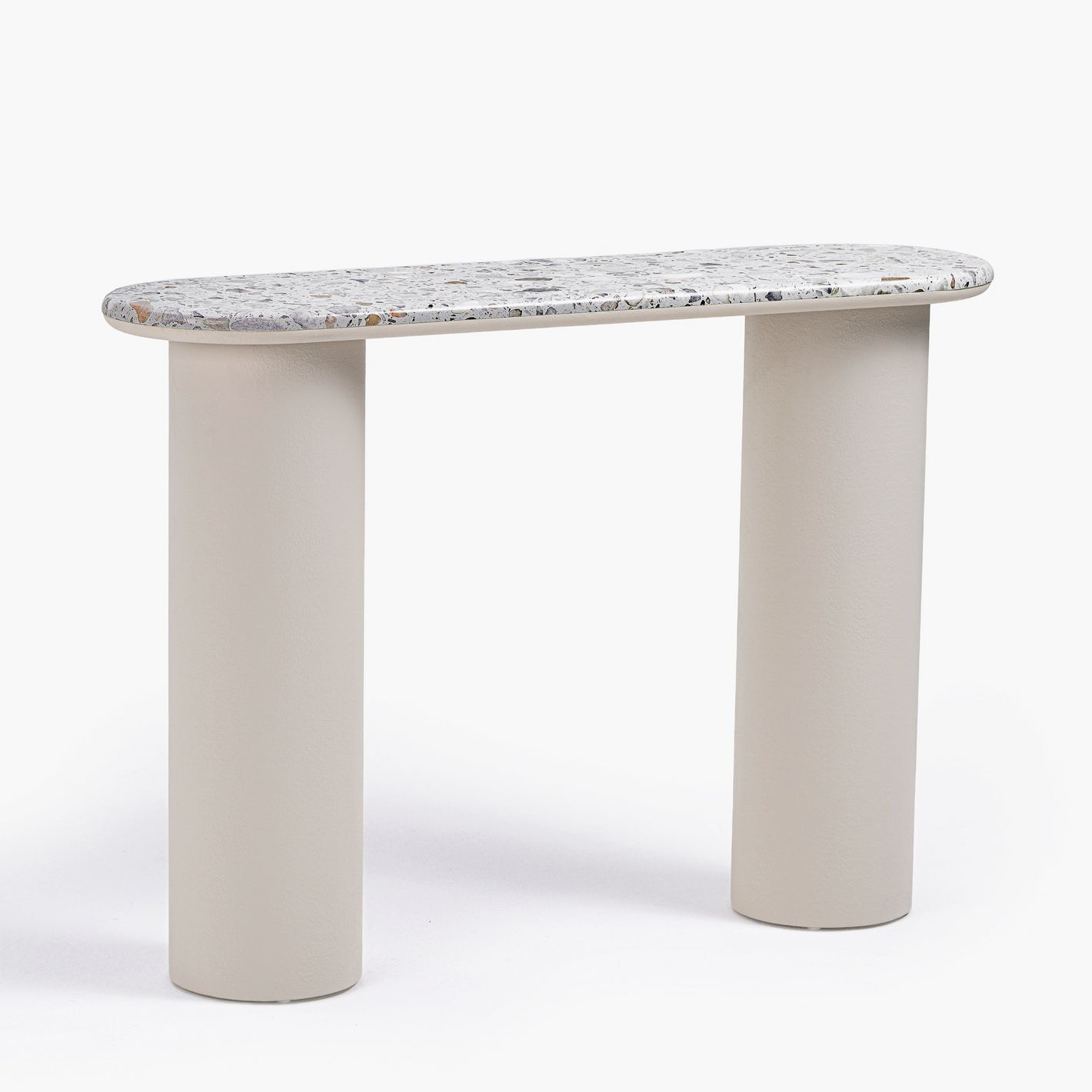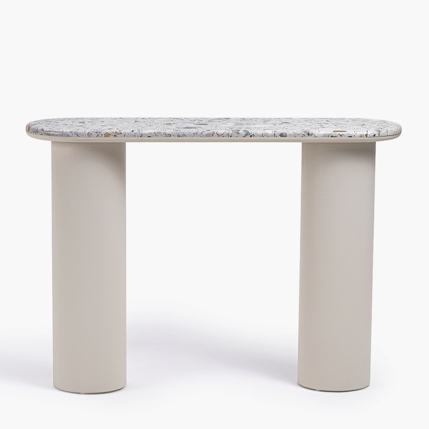 Featuring a smooth, rounded terrazzo top paired with two bold cylindrical legs in a plaster finish, this console table captures the essence of modern minimalism with luxurious detail