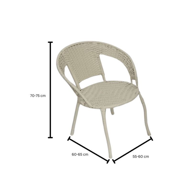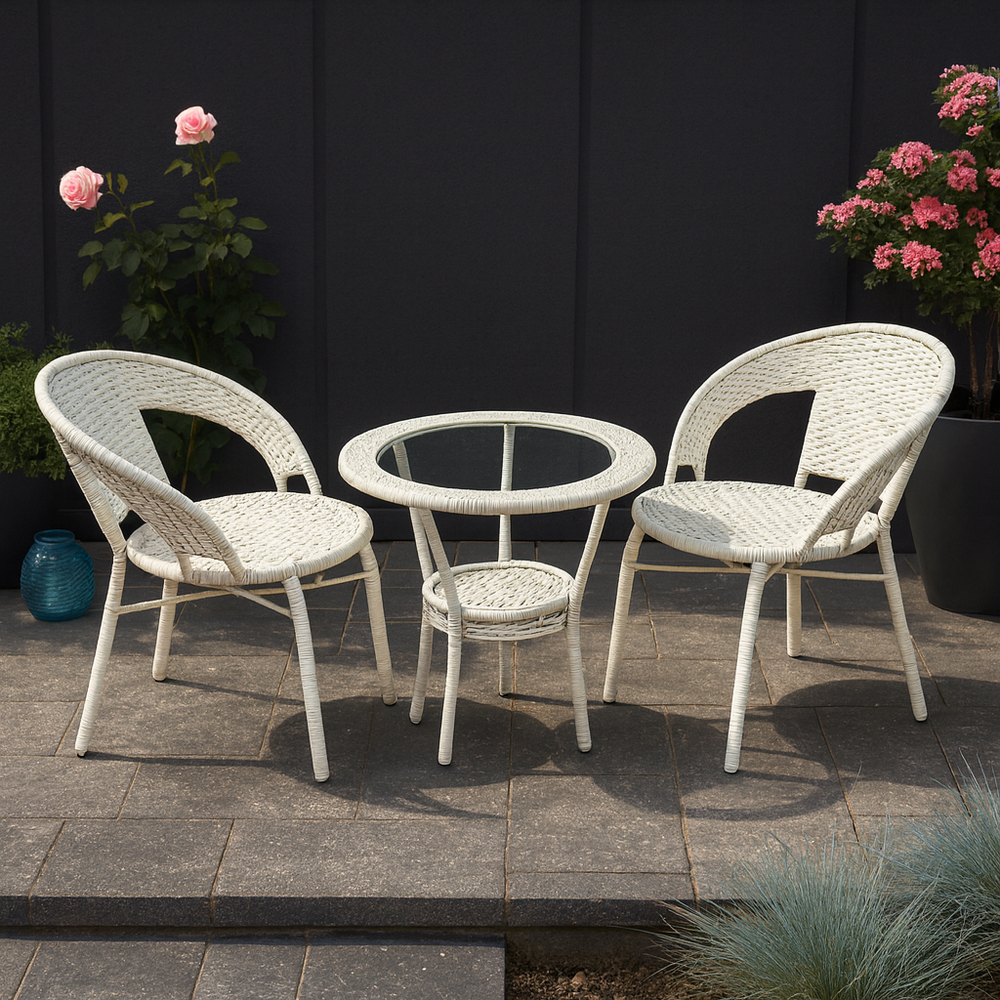 Includes a modern glass-top table and two ergonomic wicker chairs