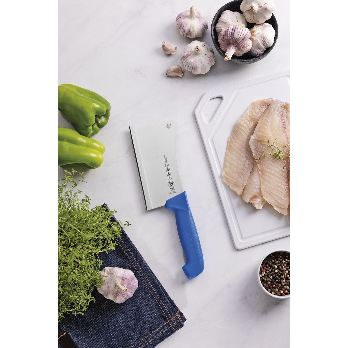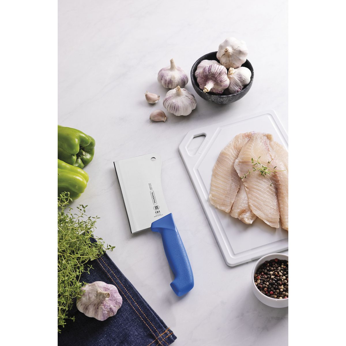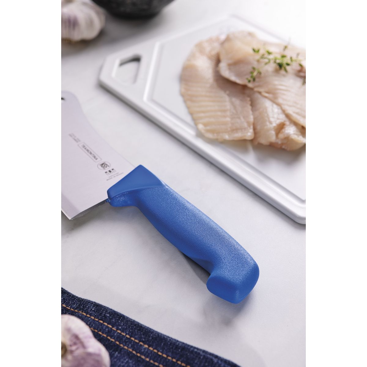 To cut through touch meat, bones and other stiff ingredients that require greater precision and efficiency during preparation, use the Tramontina Professional 6-inch cleaver with stainless-steel blade and blue polypropylene handle