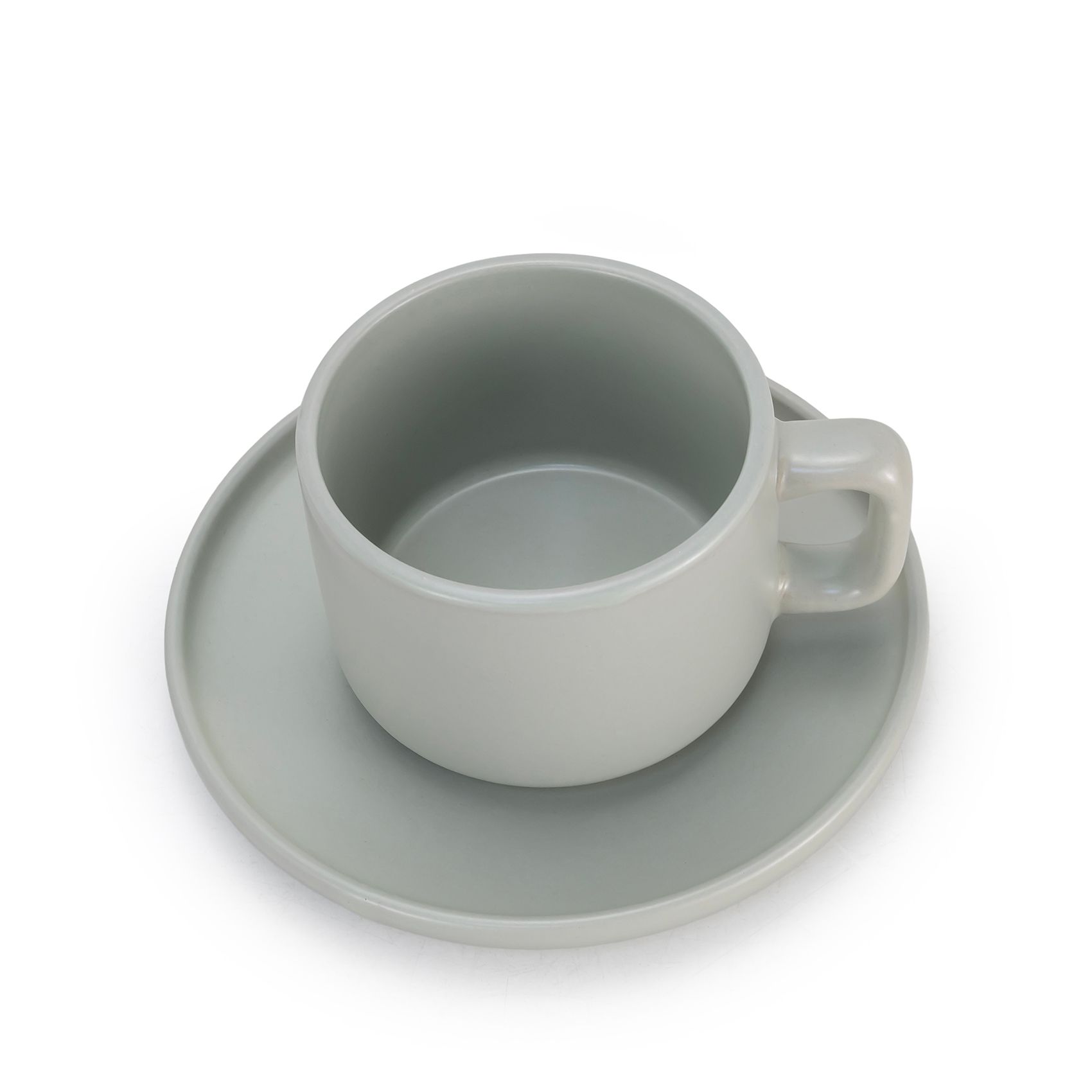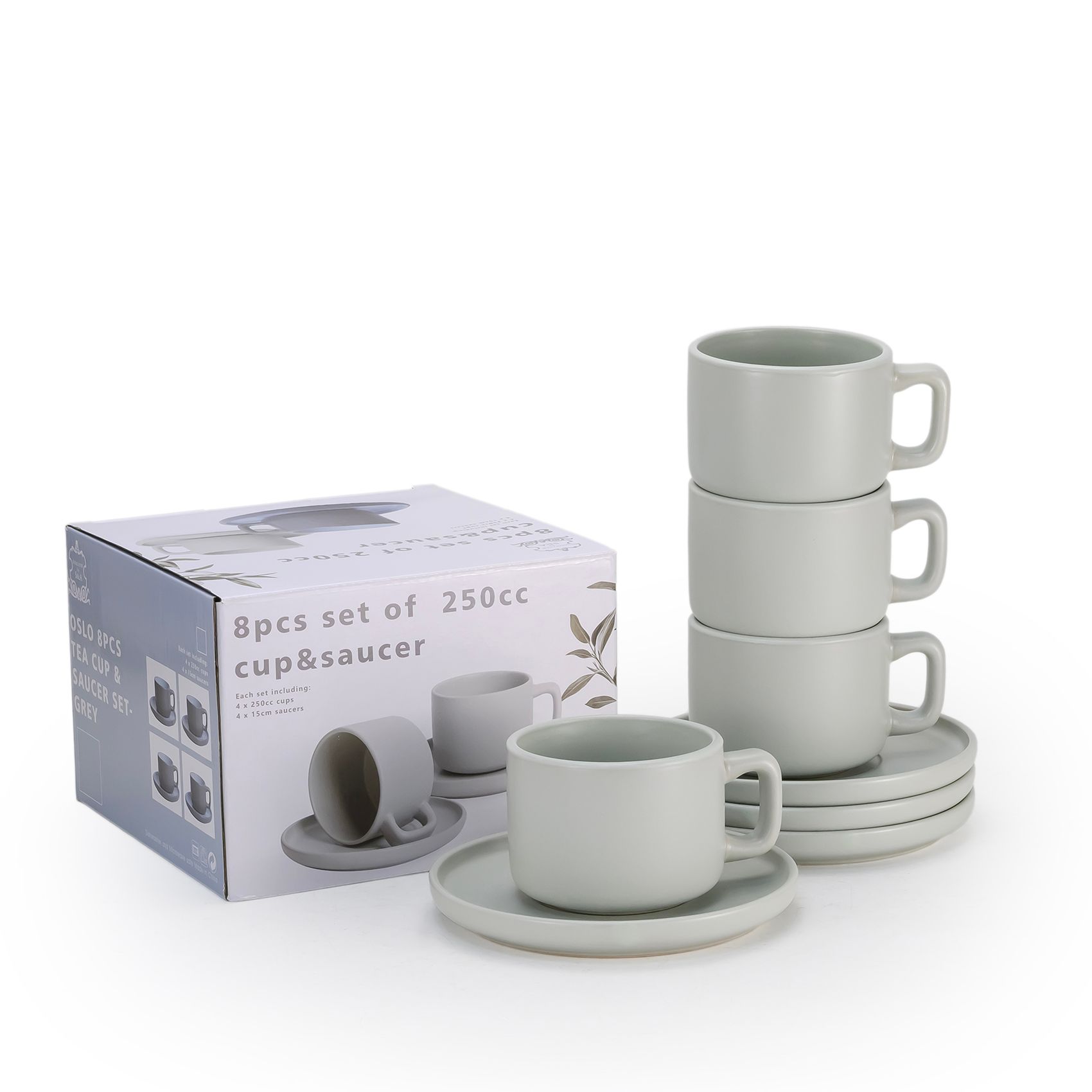 Shallow Stoneware OSLO 8-Piece Tea Cup & Saucer Set-250ml - Elegant Green Nordic Style CeramicCrockery| 4×250ml Tea Cups & 4×Matching Saucers