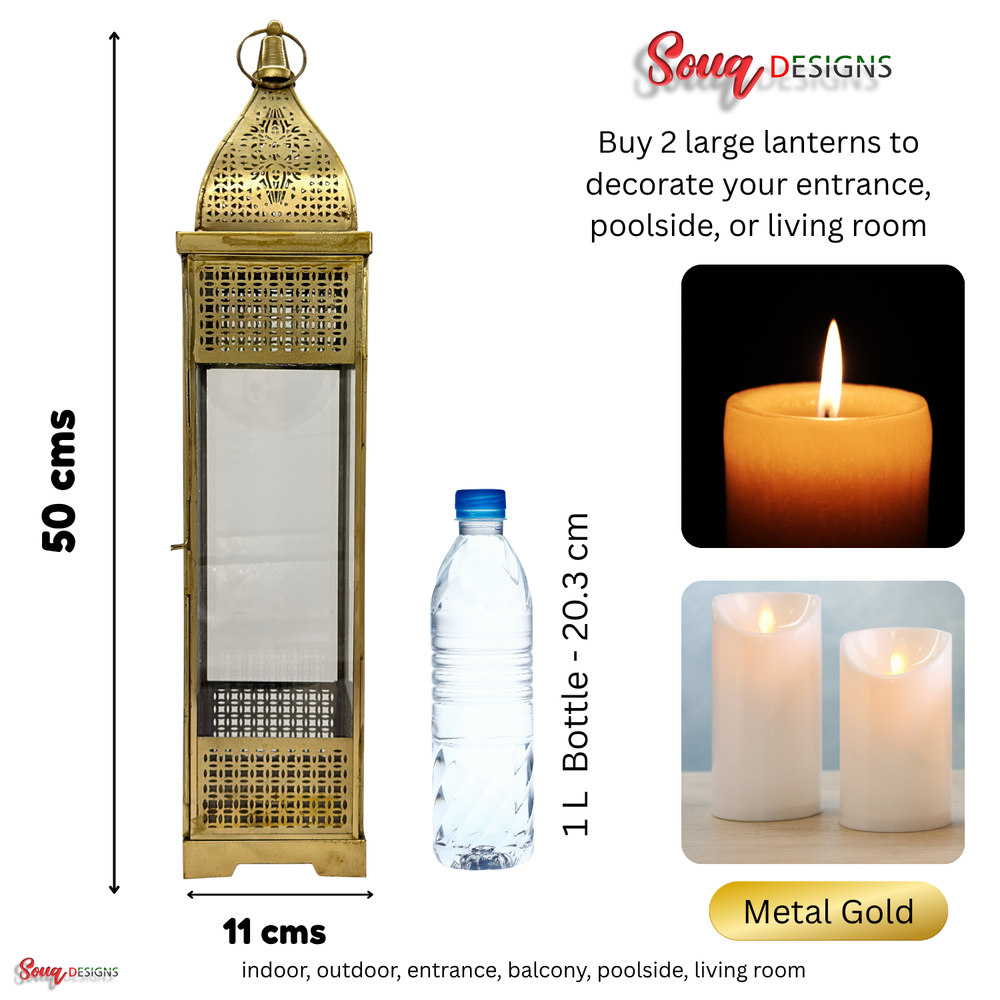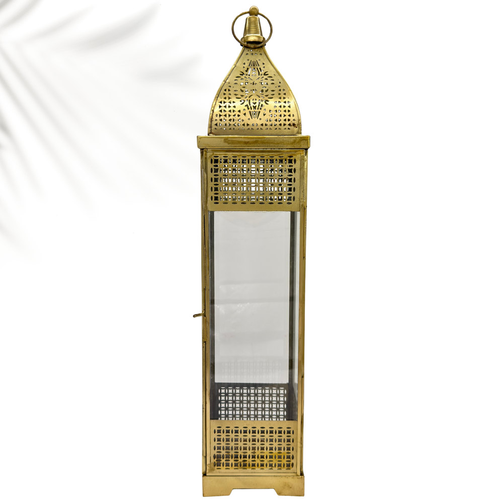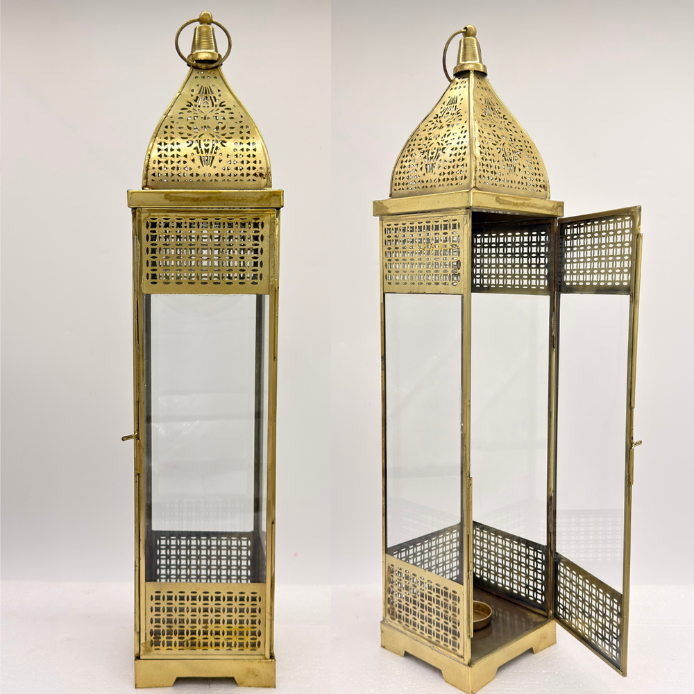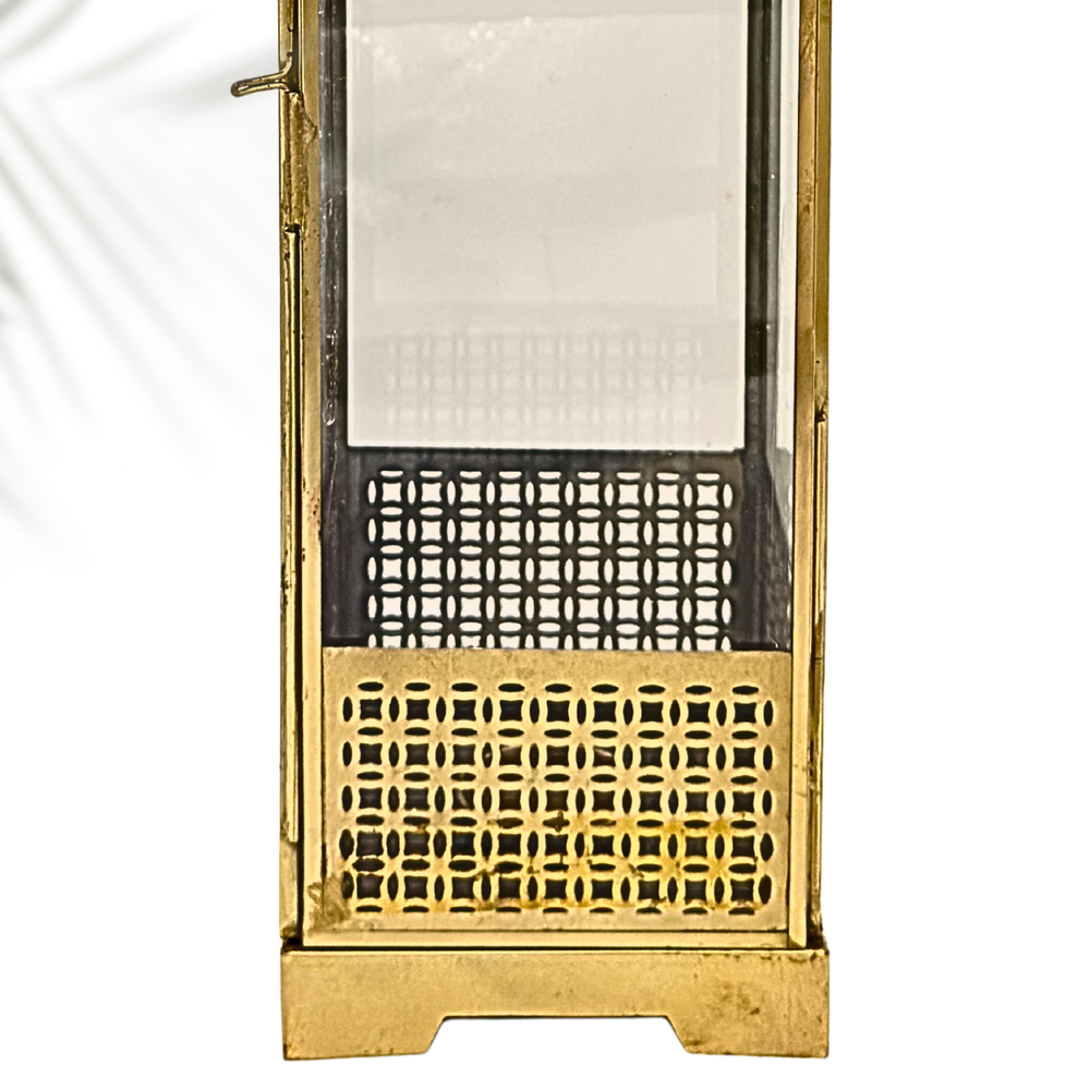 Designed in an Arabic architectural style, this lantern reflects the beauty of Middle Eastern décor, making it a wonderful choice for Ramadan, Eid, Christmas, weddings, and other festive occasions. The golden metal finish paired with clear glass panels allows light from candles or LED lights to shine beautifully, creating a cozy and inviting atmosphere