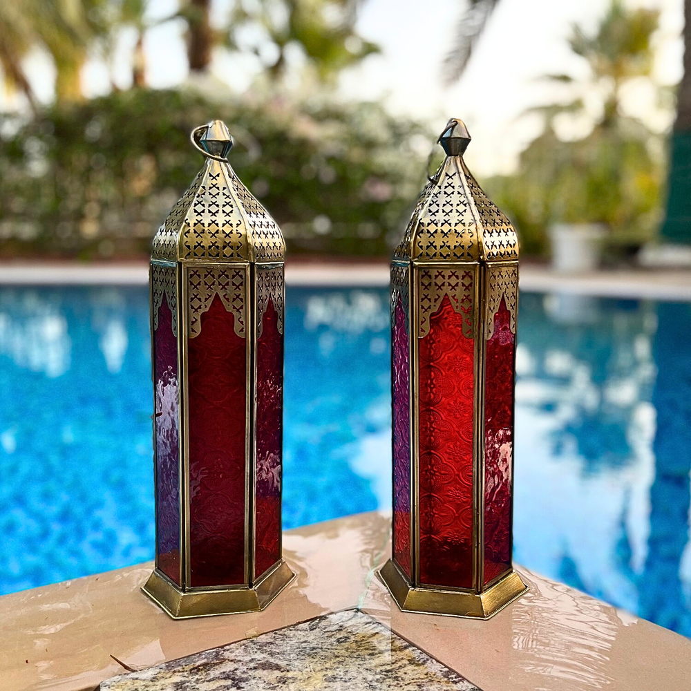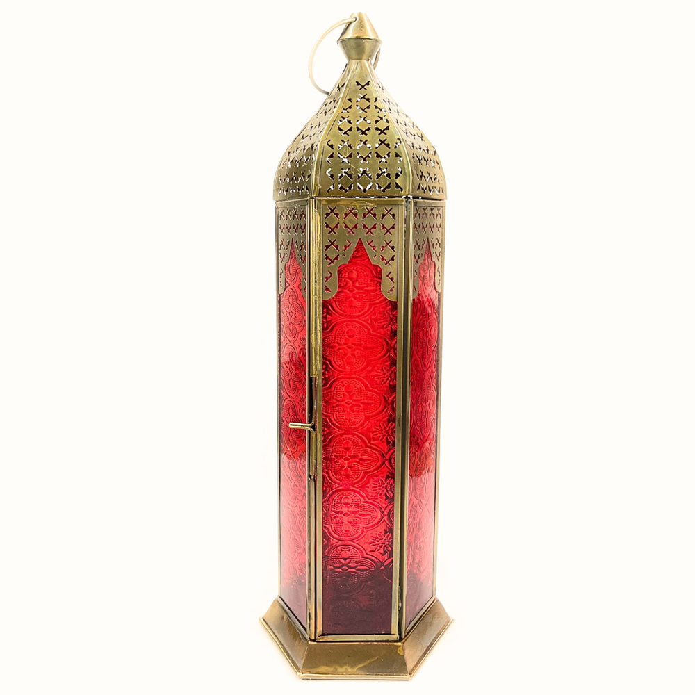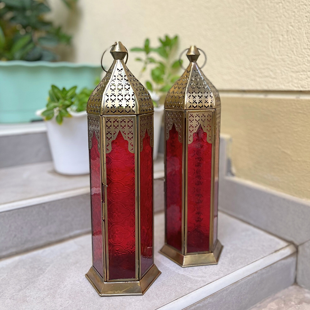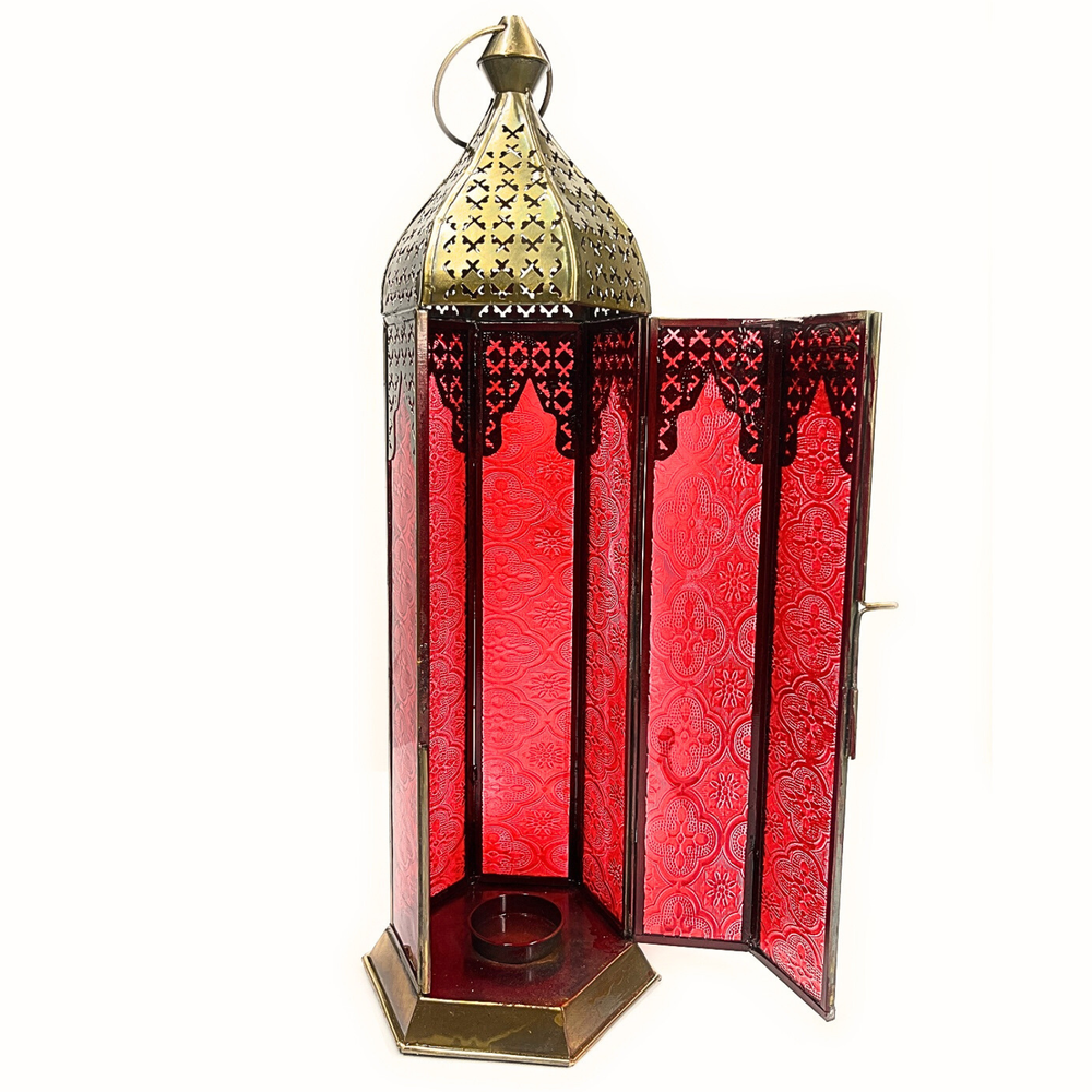 Lantern for Decor – Arabic Fanoos Style Ramadan Lantern, Large Candle Holder for Majlis, Balcony & Outdoor Home Decoration Golden Metal Yellow Glass Moroccan Candle Holder 1 pc Red