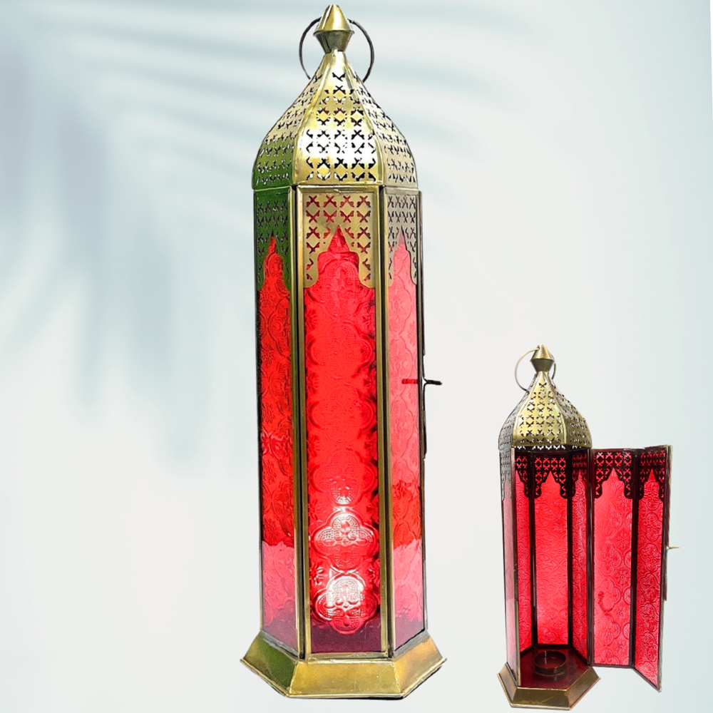 Bring home the charm of tradition with this Golden Arabic Ramadan Lantern big size made from metal with colored glass. Designed with a beautiful Arabic style, this lantern adds warm light and festive vibes to your space. Perfect for Ramadan, Eid decorations, Diwali, and Christmas, it can be used as a candle holder indoor or outdoor – on your balcony, living room, dining table, or even as a hanging lantern