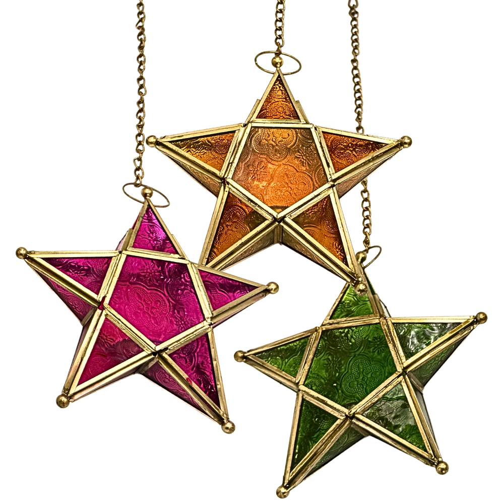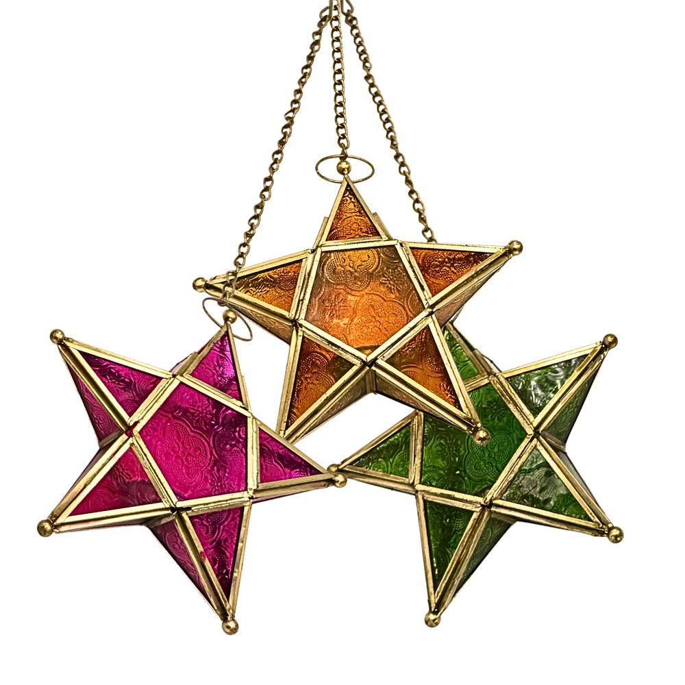 Bring home a festive glow with the Souq DESIGNS Star Lantern Set of 3 – crafted in metal with colorful embossed glass. Each lantern measures 20x20x5 cm and comes with a 25 cm chain for hanging, making it perfect as a lantern hanging indoors or outdoors