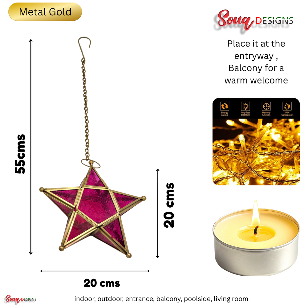 Lantern Set of 3 – Star Metal Lanterns Fanoos Candle Lantern for Eid & Diwali Gift, Majlis Hanging Moroccan Lantern Decoration, Arabic Style Ramadan Decorative Lights 20x20 cm GYP