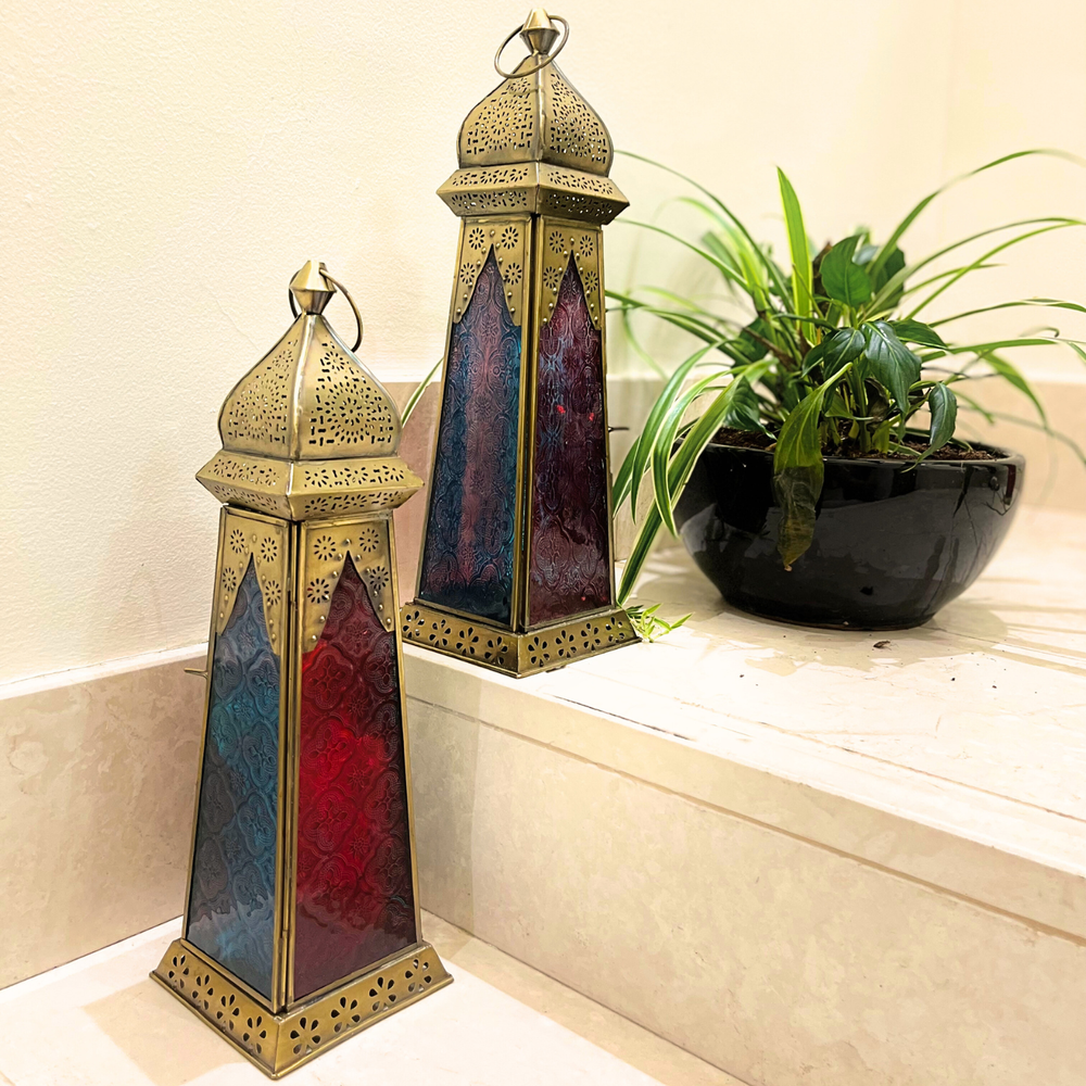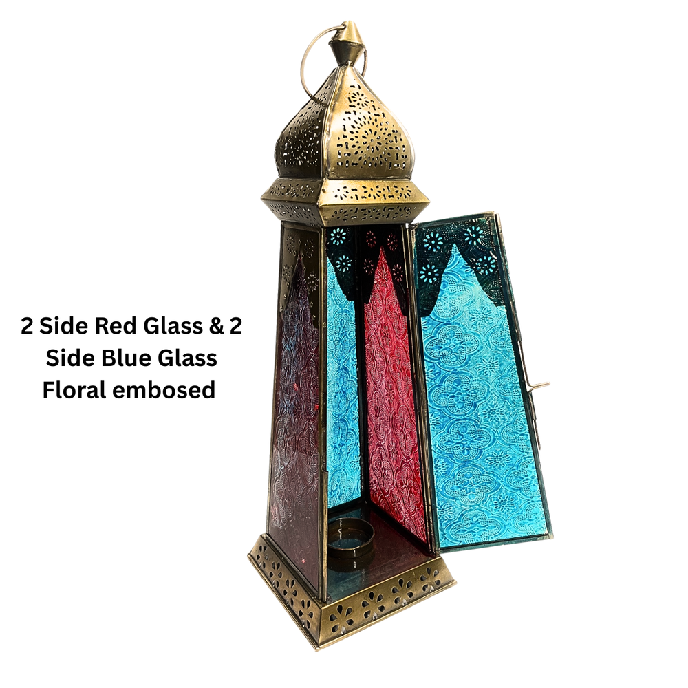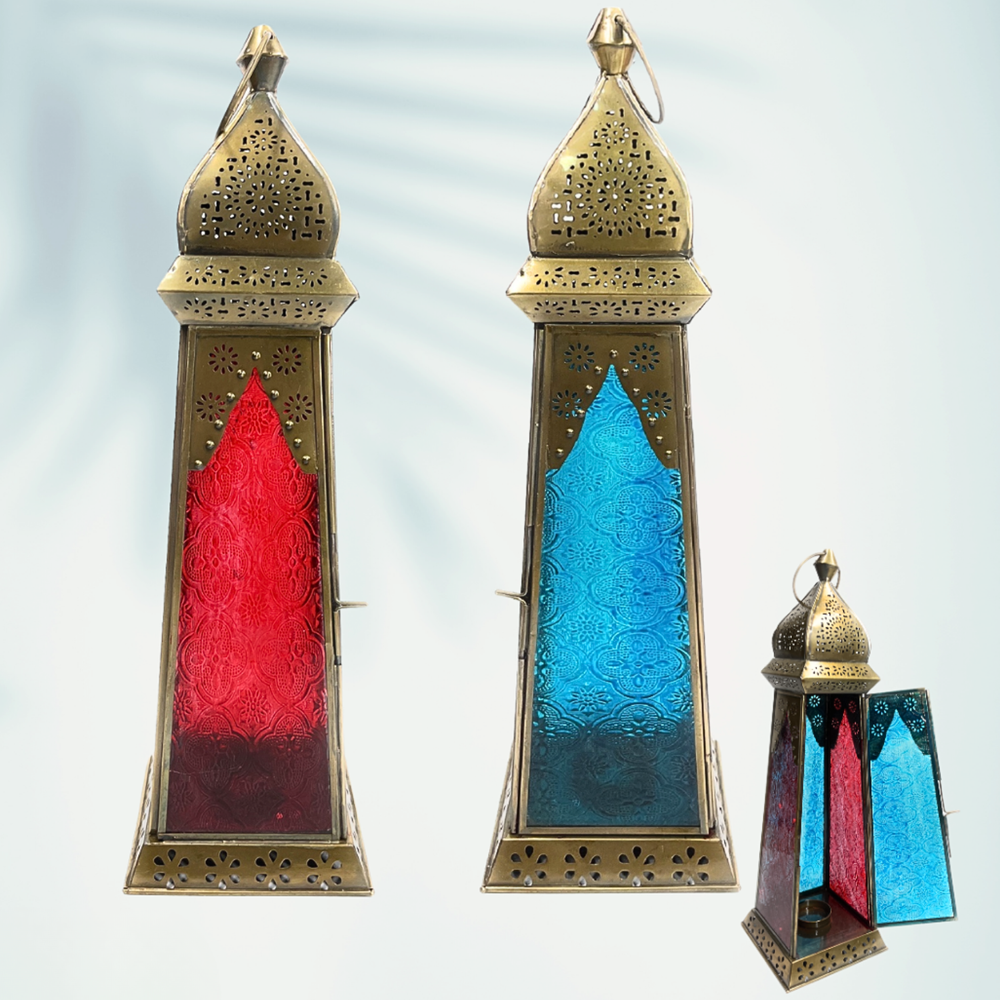 Bring home the charm of tradition with this Golden Arabic Ramadan Lantern big size made from metal with colored glass. Designed with a beautiful Arabic style, this lantern adds warm light and festive vibes to your space. Perfect for Ramadan, Eid decorations, Diwali, and Christmas, it can be used as a candle holder indoor or outdoor – on your balcony, living room, dining table, or even as a hanging lantern