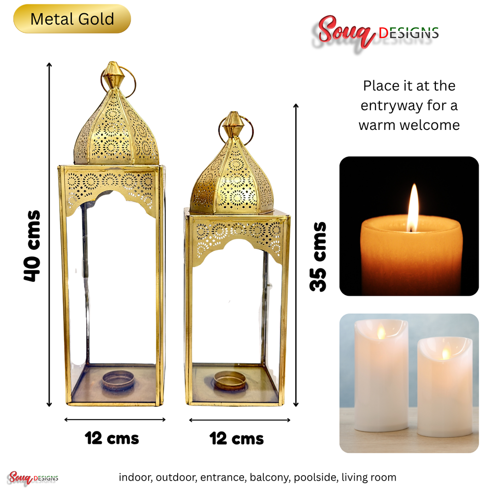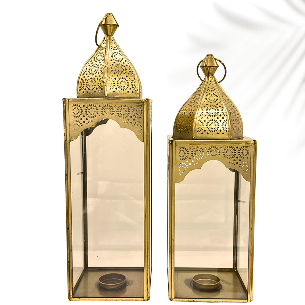Moroccan lanterns with this Set of 2 Suqare Ramadan Lanterns crafted in gold metal and plane glass. Each set includes one large lantern (40 cm) and one small lantern (35 cm), giving you the perfect mix of sizes for decorative layering