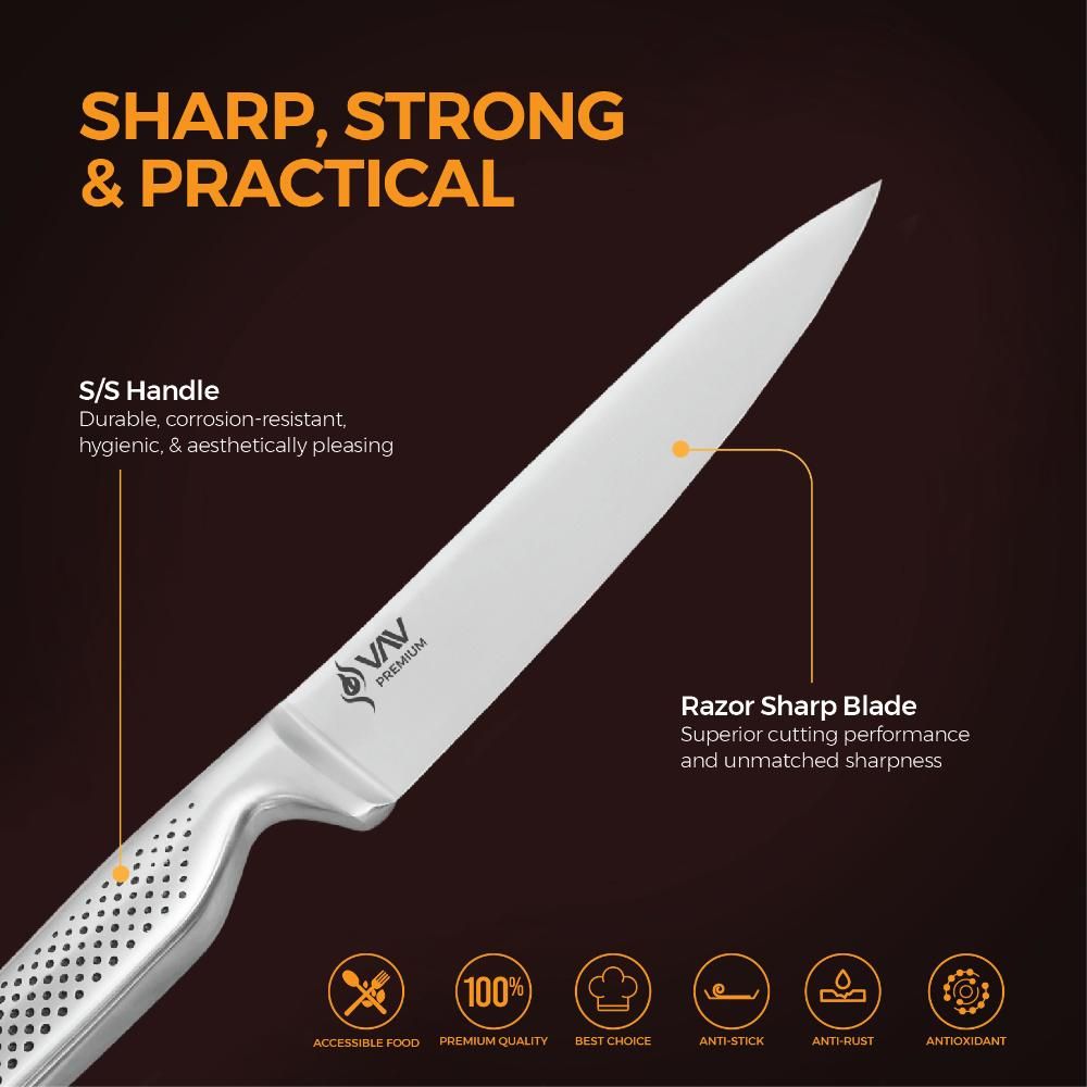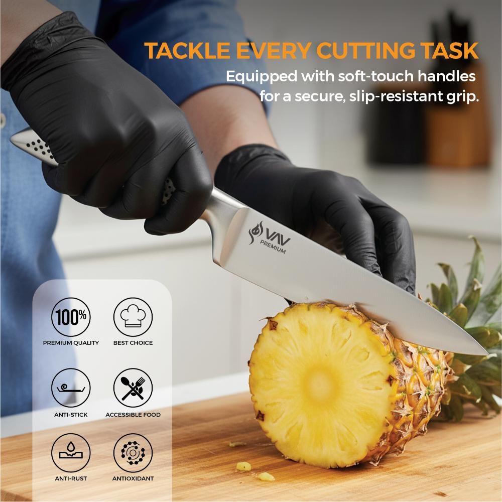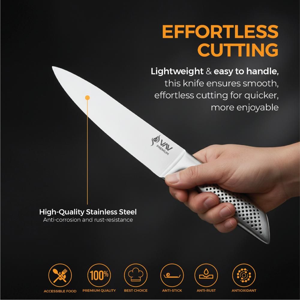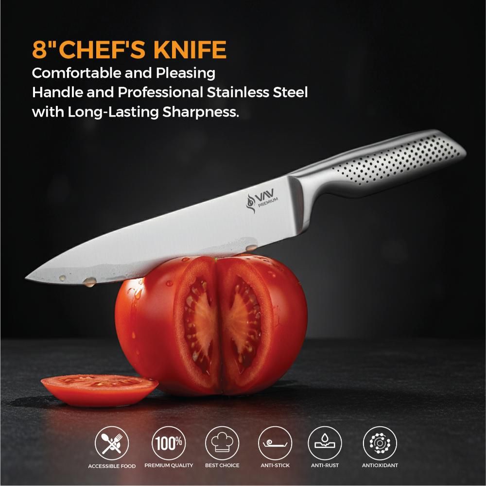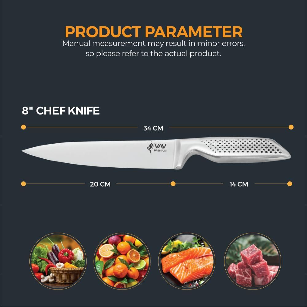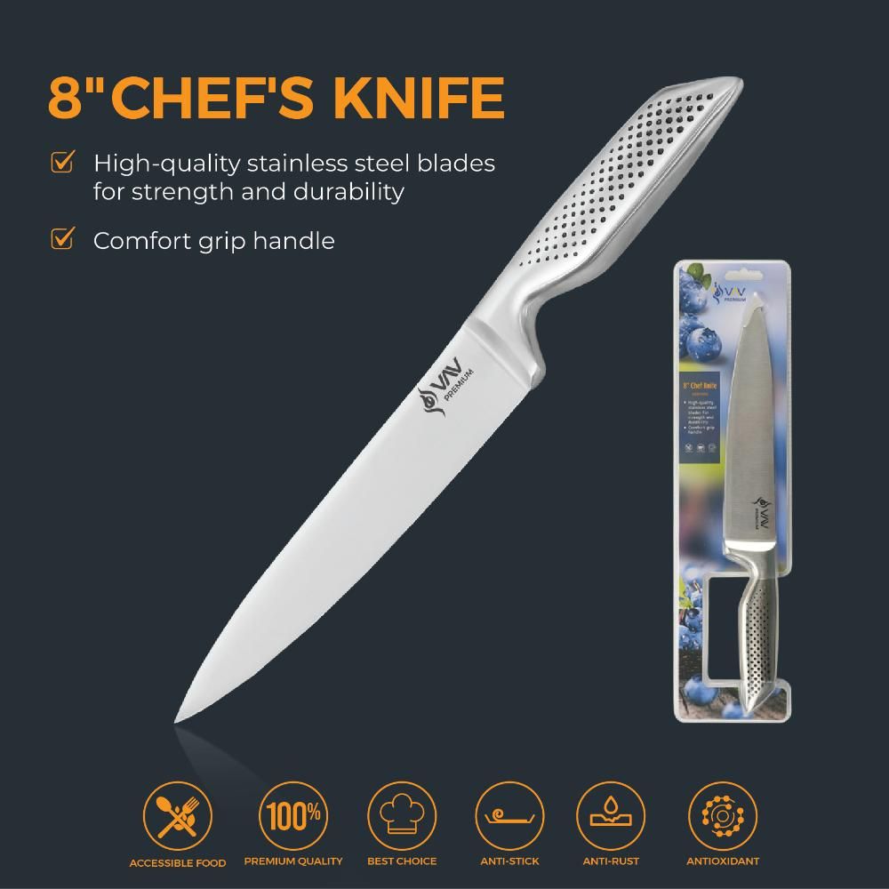 • VAV GET PREMIUM 8-inch Chef's Knife brings together a unique mix of quality sharpness, great value, durability & professional crafted accuracy. Now anyone, newbie cook or master chef can enjoy cooking much faster, easier, cleaner.