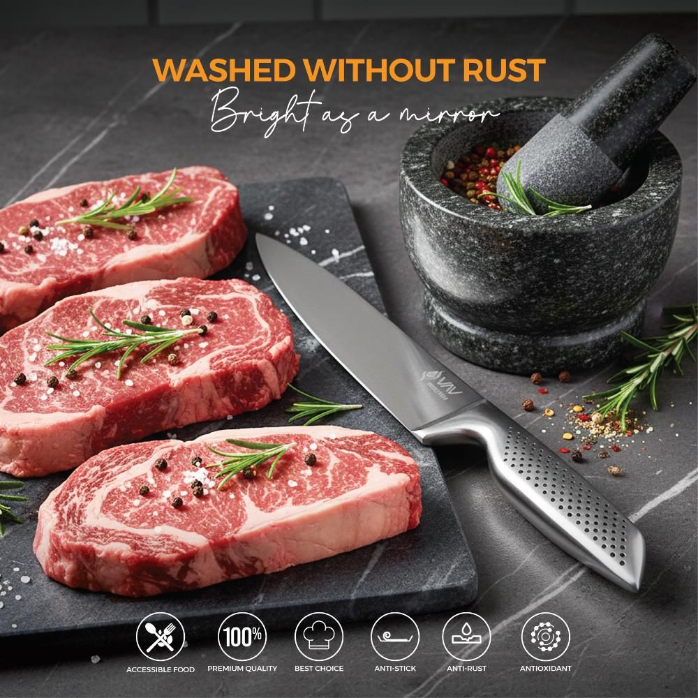 SHARP, STRONG & PRACTICAL - Premium, Professional Quality at its BEST, the best materials to update your cooking! VAV GET Premium 8-inch Chef's Knife gives you superior blades featured with non-stick effect and comfortable pleasing handle. No rust, No stains!