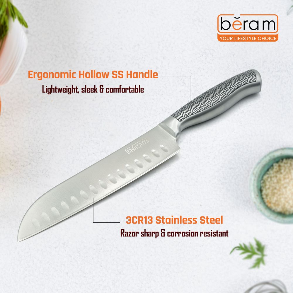 The 7-Inch Santoku Knife with Hollow Stainless Steel Handle is a kitchen workhorse, blending precision performance with sleek, modern design