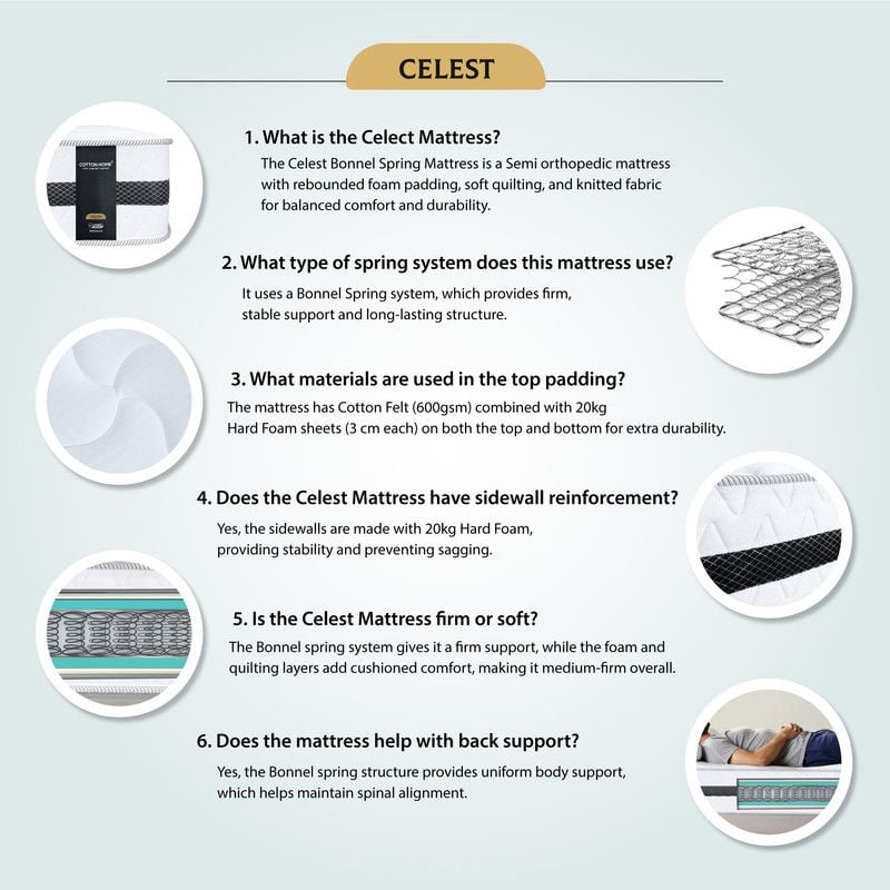 The Celeste T.Top Bonnel Spring Mattress combines firm orthopedic support with a soft quilted top for lasting comfort. Designed with durable Bonnel springs, reinforced foam borders, and breathable knitted fabric, this mattress is a perfect choice for everyday use, guest rooms, or rentals.