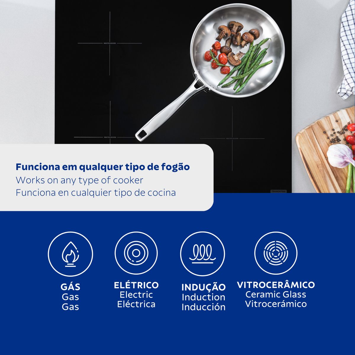 Tramontina's 20 cm 1,2 L shallow stainless steel frying pan with long handle has a tri-ply body (stainless steel + aluminum + stainless steel), which speeds up the cooking process