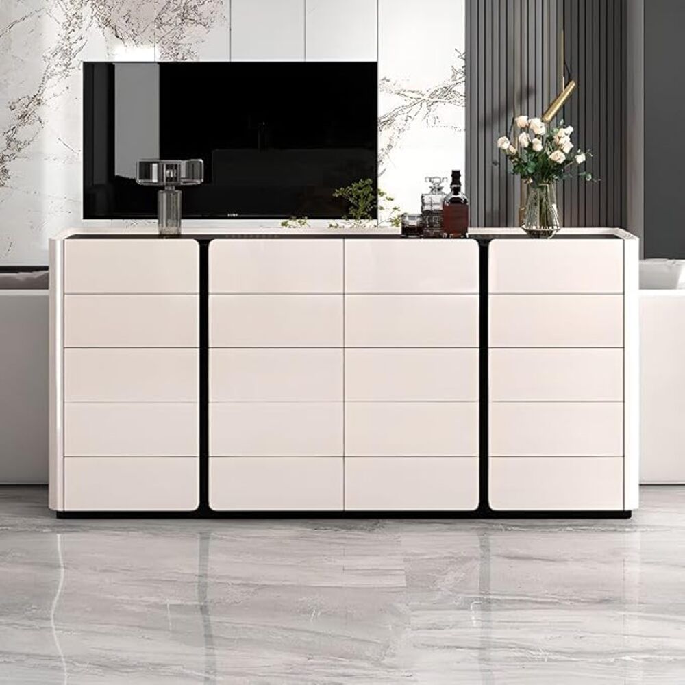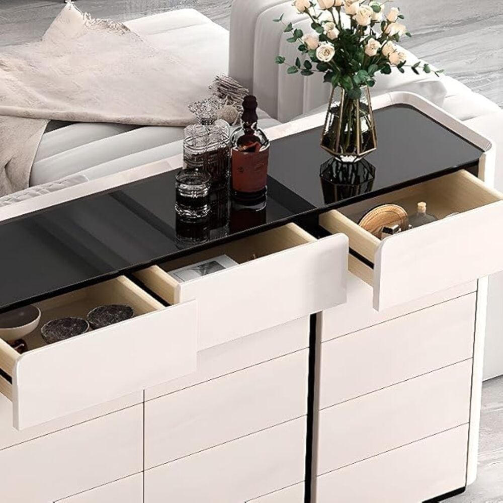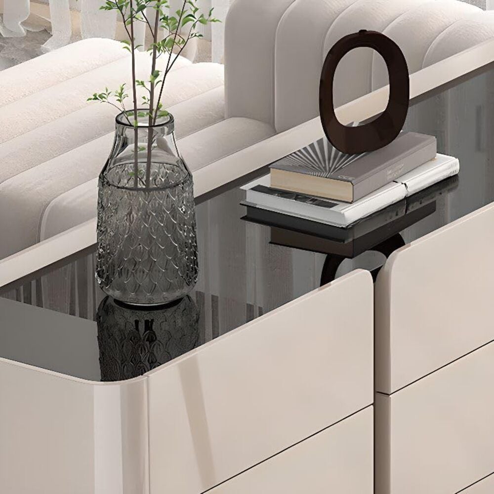 【CONSTRUCTION】 Durable cabinet with 4 pull-out drawers and tempered glass top surface for additional decorative display space