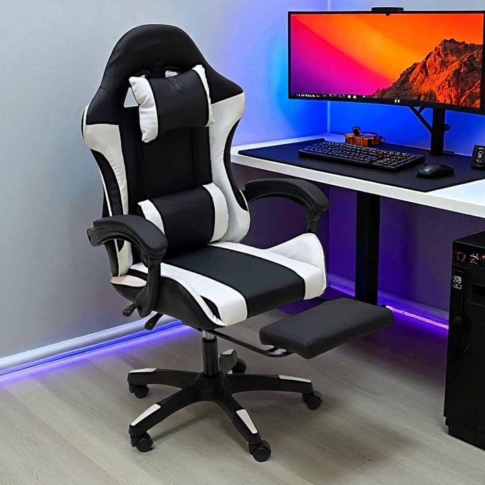 SBF Gaming Chair with Footrest – High Back PU Leather Ergonomic Office Desk Chair with Adjustable Height, Reclining Backrest, Headrest & Lumbar Support – Swivel Computer Gaming Chair, White Black