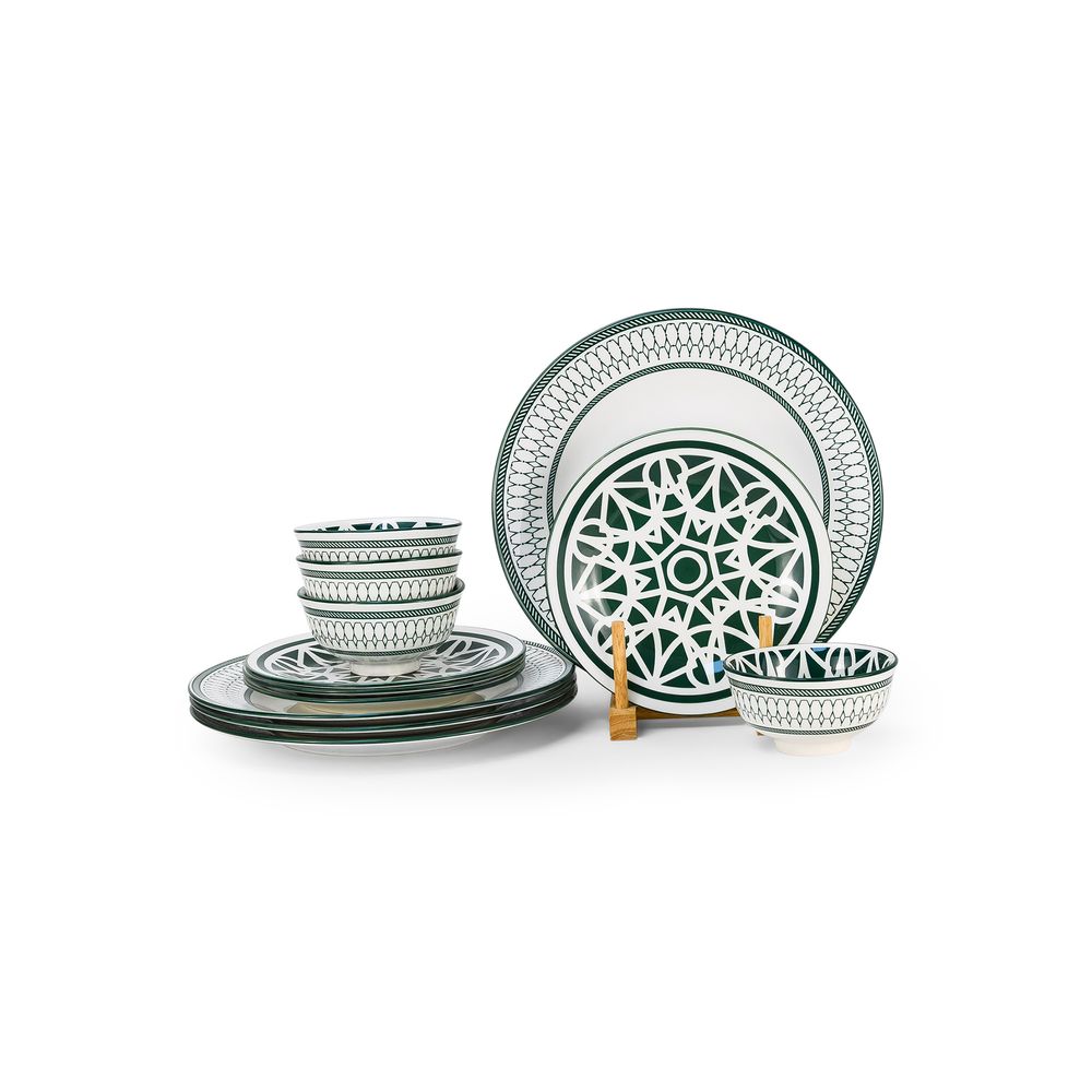 Shallow Porcelain AMALFI 12-Pc Dinner Set-Elegant Green Modern Crockery|4×10.5” Dinner Plates,4×7.5”Side Plates&4 × 4.5”Small Bowls