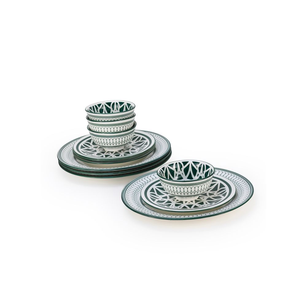 Elevate your dining experience with the Shallow Porcelain AMALFI 12-Piece Dinner Set in Elegant Green, designed to combine modern style, durability, and everyday convenience