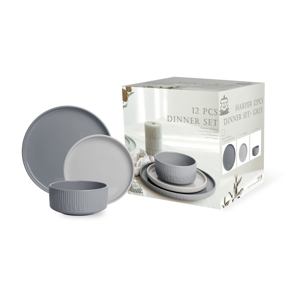 Enhance your dining experience with the Shallow Stoneware HARPER 12-Piece Dinner Set in Elegant Grey, designed to bring a perfect balance of Nordic-inspired style, durability, and everyday functionality