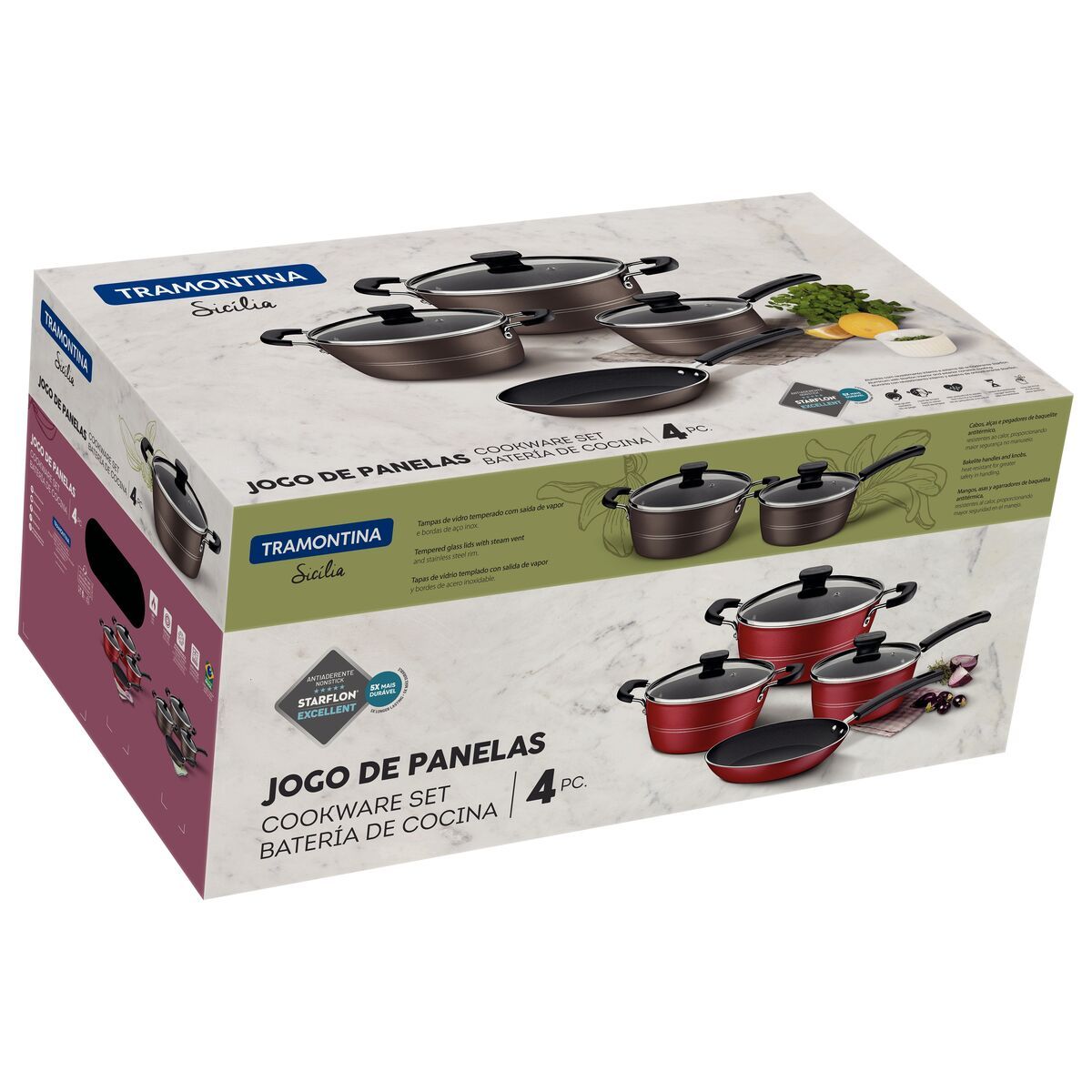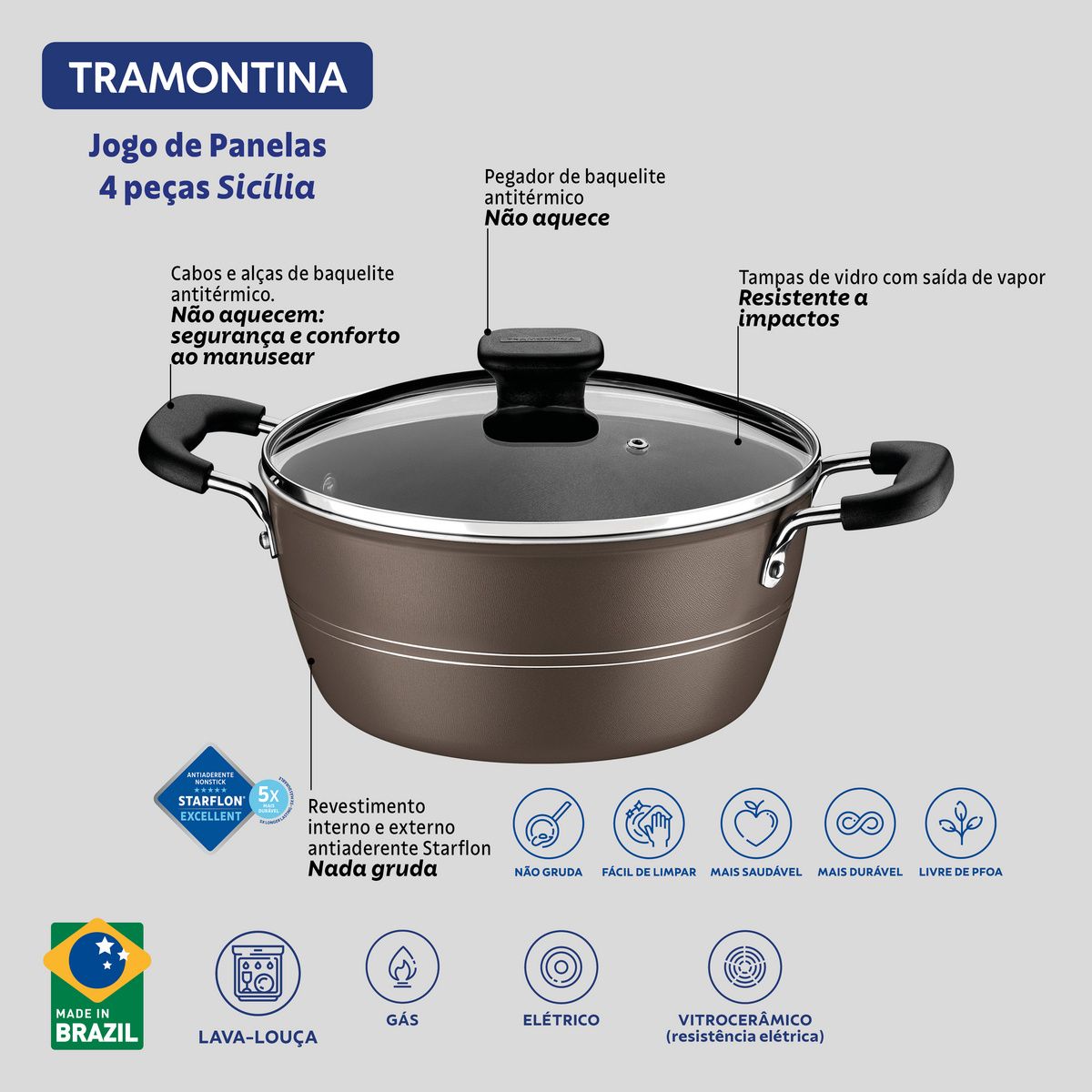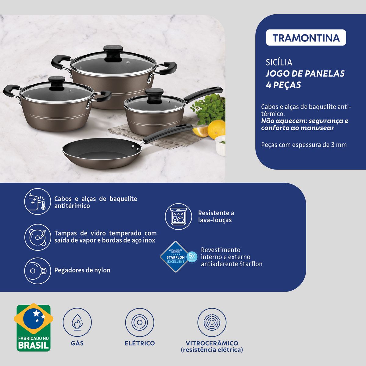 Your kitchen will be much more complete and stylish with the Tramontina Sicília hazelnut aluminum cookware set with interior and exterior Starflon Excellent nonstick coating, 4 pieces! It has pieces made of aluminum with interior and exterior Starflon Excellent nonstick coating, which provides uniform cooking, preventing food from sticking to its surface and making it more resistant and durable