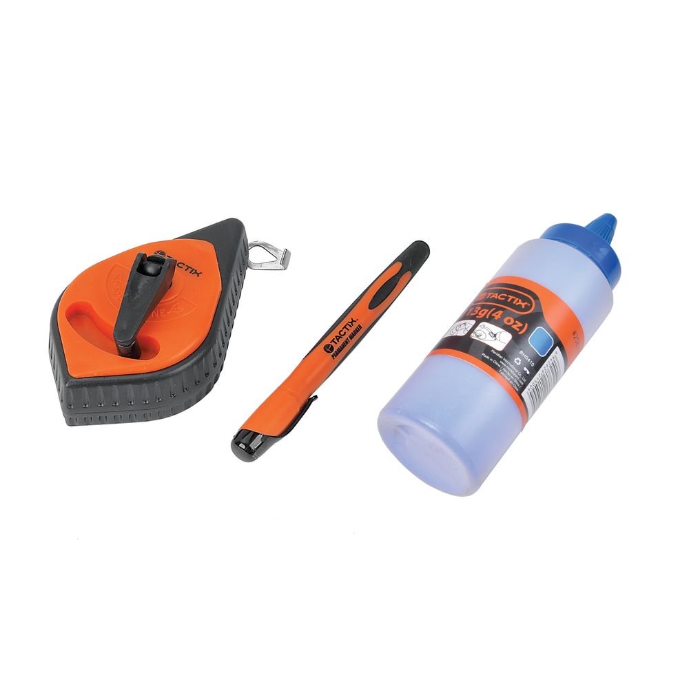 Tactix 3 PC Chalk Line Set, 30m (100ft) Chalk Line Reel, 113g Blue Chalk, Oil & Water Resistant Black Marker for Accurate Marking, Durable Tools for Construction & DIY Projects- 258055