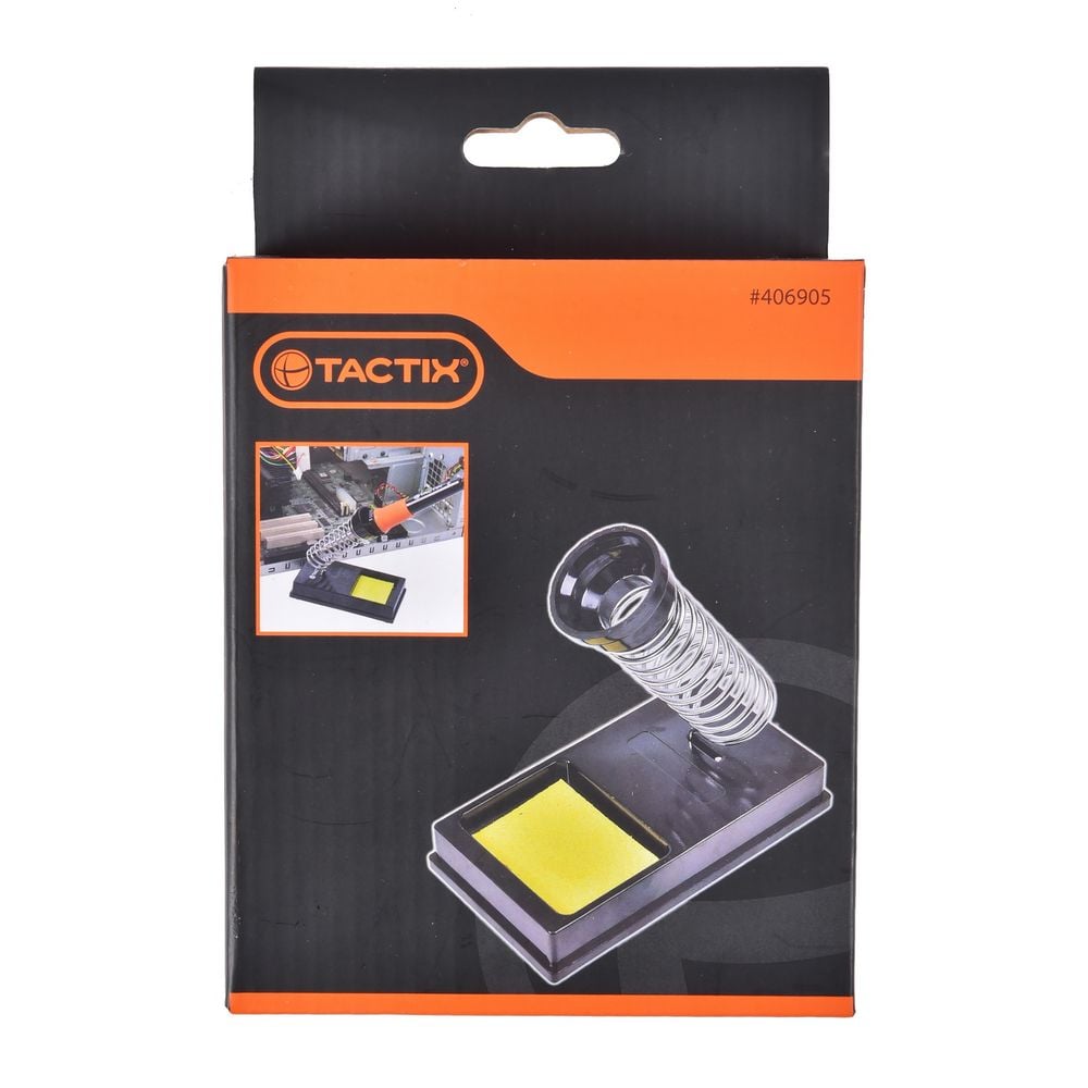 The stand features a sturdy metal coil holder that provides a snug fit for your soldering iron, preventing it from rolling or tipping over during use. Whether you're working on circuit boards, repairing electronics, or tackling DIY projects, the Tactix soldering iron holder ensures precision, safety, and stability throughout.