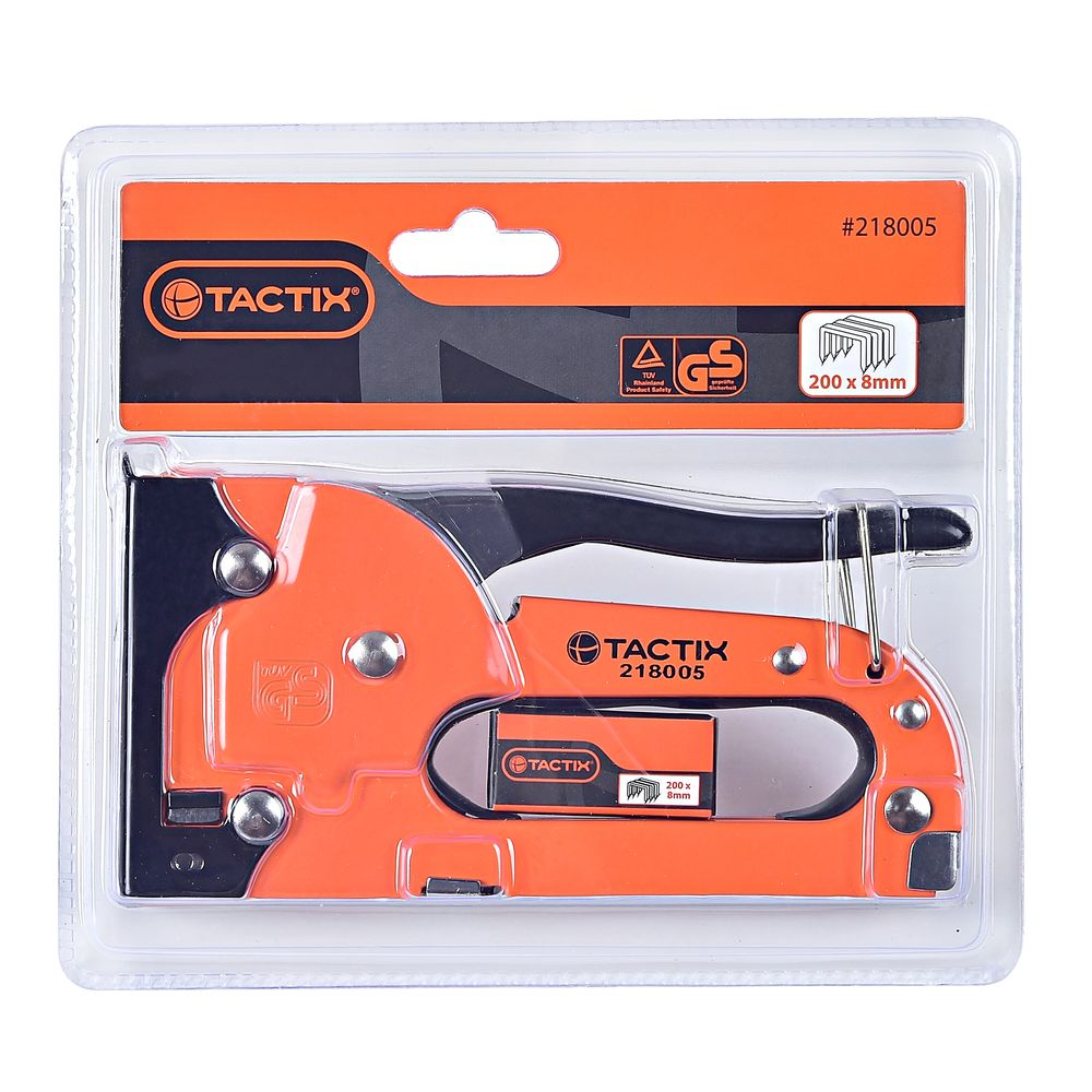 Tactix Staple Gun, Multipurpose, Heavy Duty, Compatible with 4, 6 and 8mm for Upholstery, Decoration, Carpentry, Furniture, Ergonomic Handle, Black/Orange/Silver - 218005