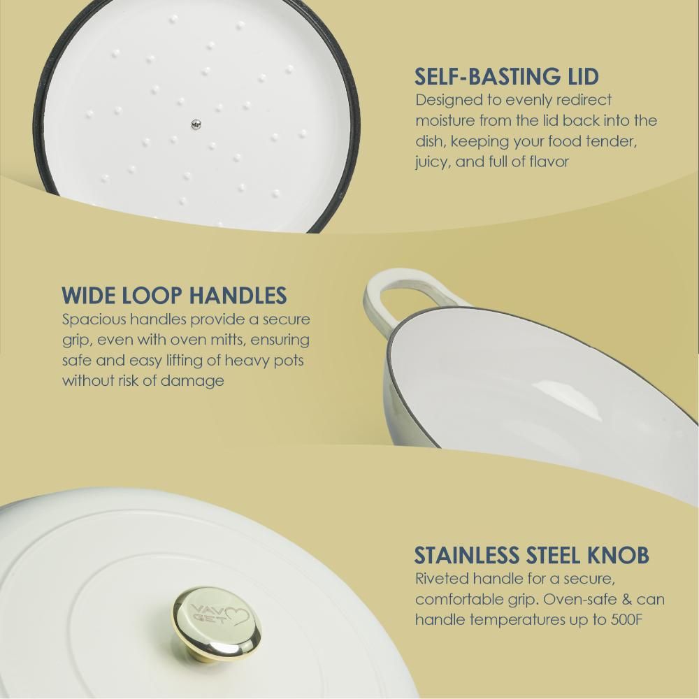 • Timeless Essential for Every Kitchen: The VAV Enameled Cast Iron Dutch Oven is designed for superior heat distribution and retention, ensuring your food is cooked evenly and gently. Suitable for all stovetops and ovens, it's a versatile choice for any cooking enthusiast.